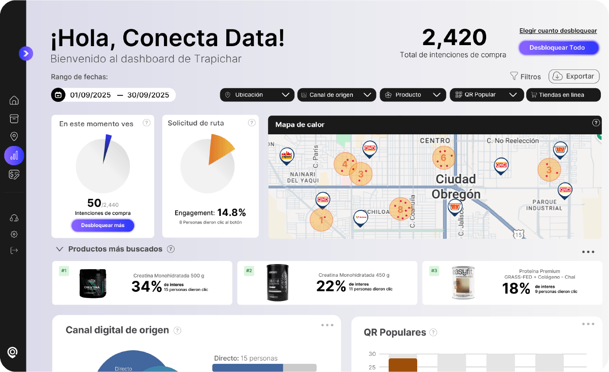Cuando el consumidor escanea o hace clic, no solo encuentra dónde comprar, también genera información en tiempo real sobre cómo, dónde y con qué frecuencia interactúa con tus productos. Así conoces cómo se comportan tus consumidores y conviertes esos datos en oportunidades para mejorar tu presencia, tus ventas y tu conexión con ellos.